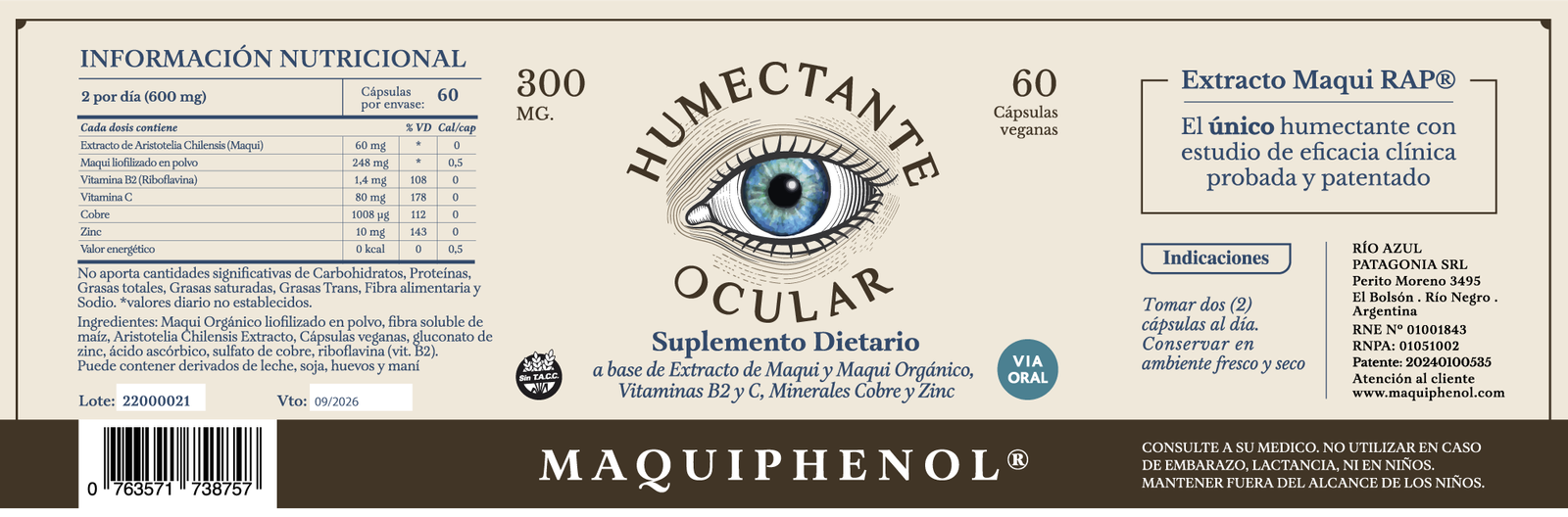 Suplemento Dietario para ojo seco a base de Extracto de Maqui-RAP® y Maqui® Orgánico, Vitamina B2, Vitamina C, Minerales Cobre y Zinc. El Extracto de Maqui-RAP® ayuda a mejorar la secreción de lágrimas. La Vitamina B2 (Riboflavina) es esencial para promover la salud ocular. La Vitamina C es un elemento crítico para la salud de los ojos. El Zinc y el Cobre contribuyen a mantener la visión en condiciones normales.